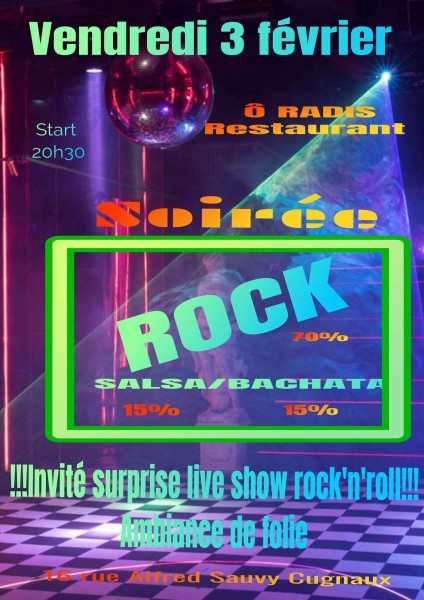 Alors venez me rejoindre pour une soirée PAPILLES ET AMBIANCE. Laissez-vous embarquer pour une soirée de folie ! 70% ROCK et 30% Latino .(initiation pour celles et ceux qui ne connaissent pas les pas de Salsa et Bachata)